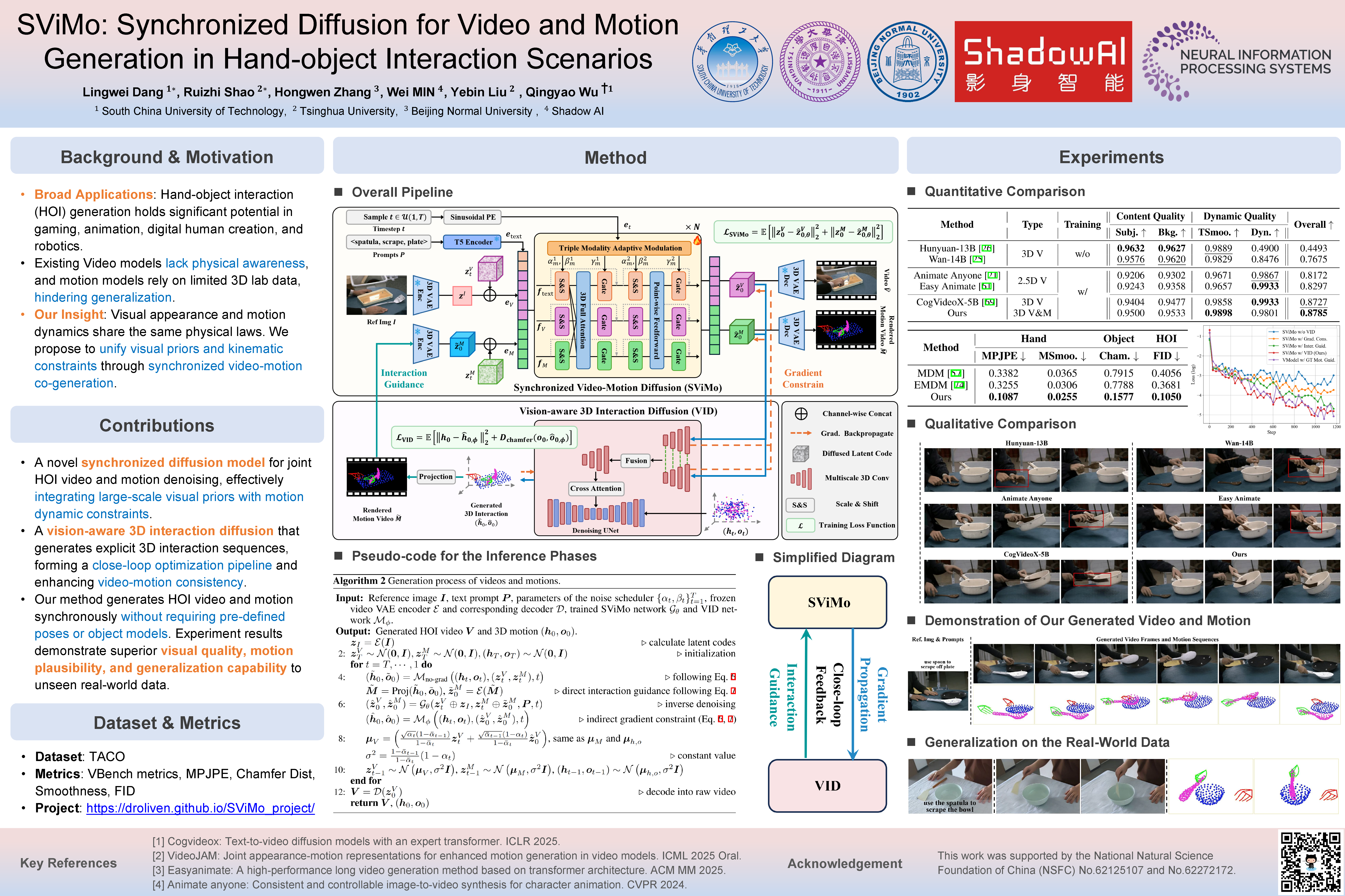 3. Our method generates HOI video and motion synchronously without requiring pre-defined poses or object models. Experiment results demonstrate superior visual quality, motion plausibility, and generalization capability to unseen real-world data.